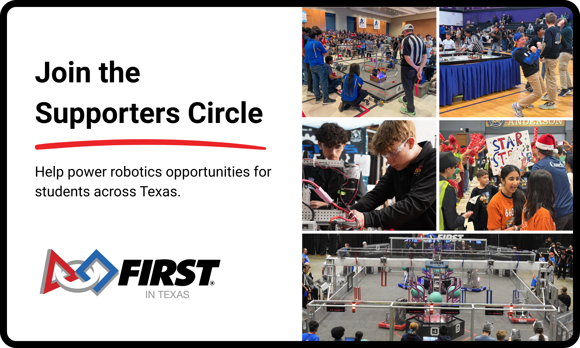 The Supporters Circle is our community of sustaining donors who provide reliable, year-round support for FIRST in Texas. Ongoing gifts allow us to plan ahead, respond to needs across the state, and ensure consistent, high-quality robotics experiences for students, coaches, and volunteers.